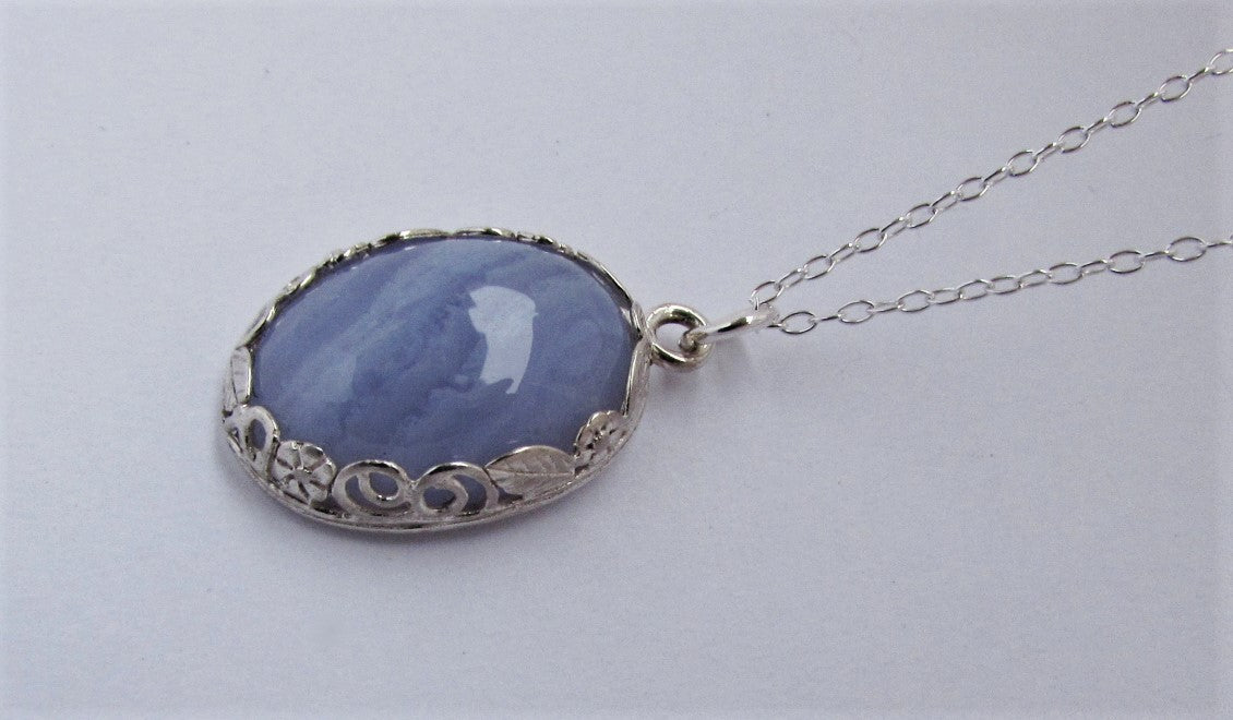 On plonge dans l'océan avec cette belle calcédoine bleue, ornée de motifs vagues et de végétaux (petites fleurs et feuilles). Argent 925, chaîne de 45 cm en argent fournie.